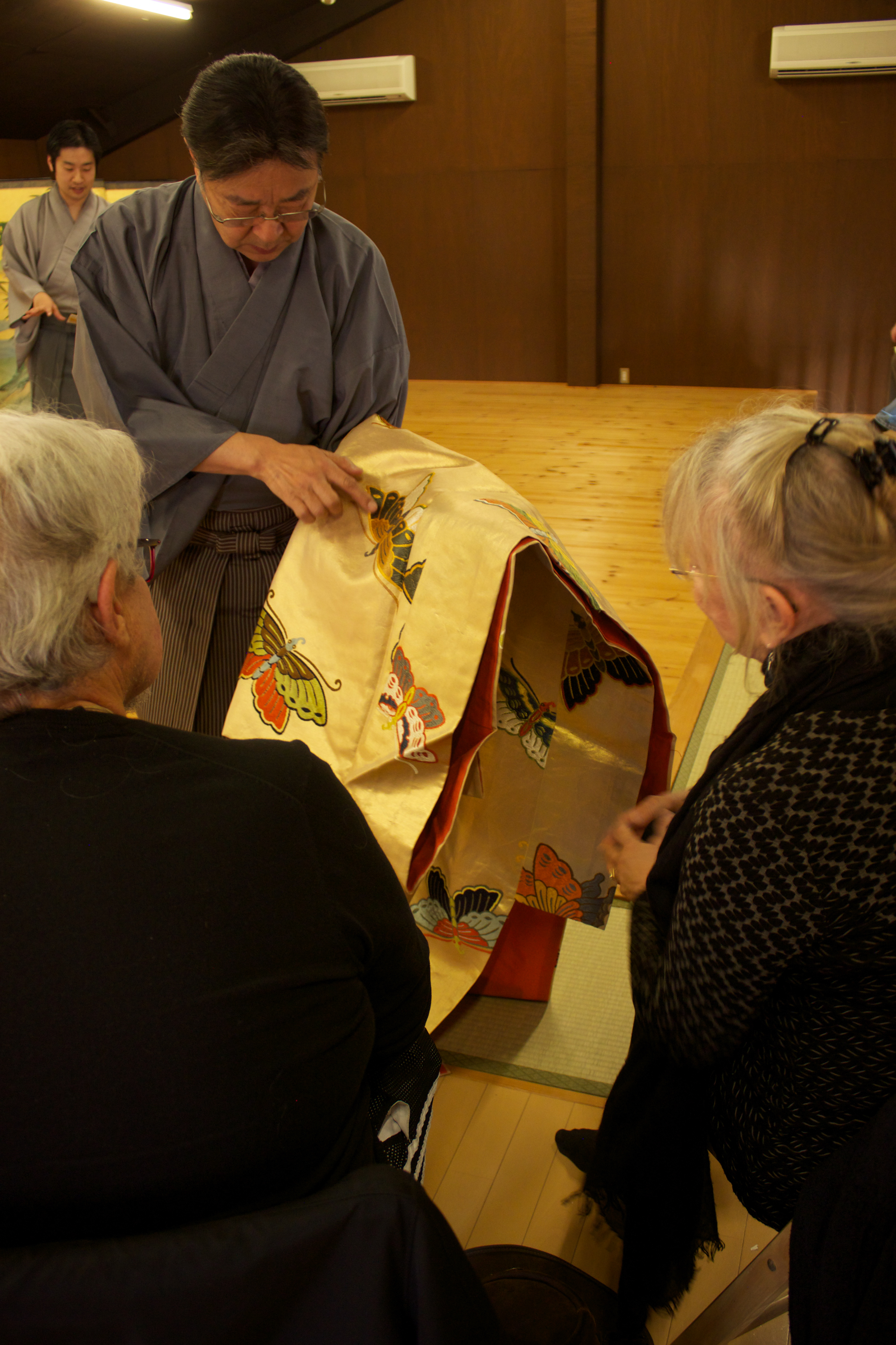 _MG_1681-10 ← Previous Next → Udaka Michishige explains the various types of textiles used for Noh costumes