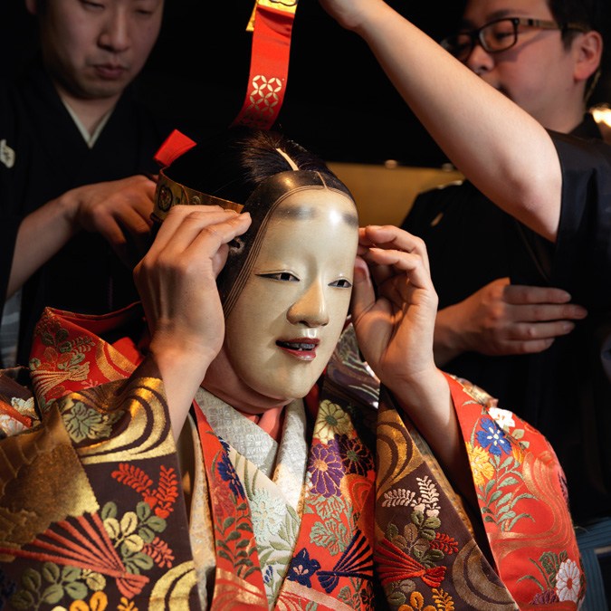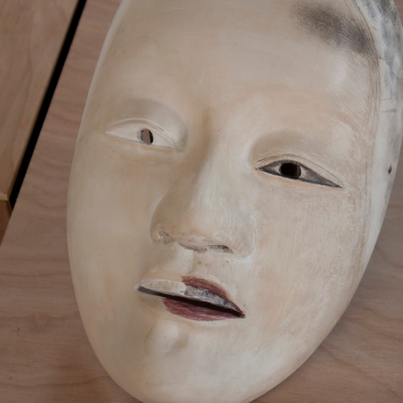 Noh masks are carved from Japanese cypress (hinoki) using traditional chisels and templates and finished with the crushed shell powder (gofun), animal glue (nikawa), and mineral pigments (iwa-enogu), the same materials used in traditional Japanese painting (nihonga). It takes between eight months to a year to complete the process of sculpting and painting a noh mask. While the noh masks are generally copies (utsushi) of traditional works, the carver always strives to discover and re-create the essence of the original mask. This requires not only technical skill but an understand and appreciation of noh itself. Through subtle nuances of carving and coloring discovered and developed through years of training and experience, the power of the masks is brought to life. A good mask is a medium for projecting emotion to an audience over a considerable physical distance. The proper modeling of the back of the mask facilitates the projection of the voice. Ultimately, a noh mask’s true beauty and character are realized when an actor wearing it on stage successfully unites intention, Chant, and movement. When these conditions are fulfilled, a state of yūgen – a harmony realized in the of the present moment – is born.