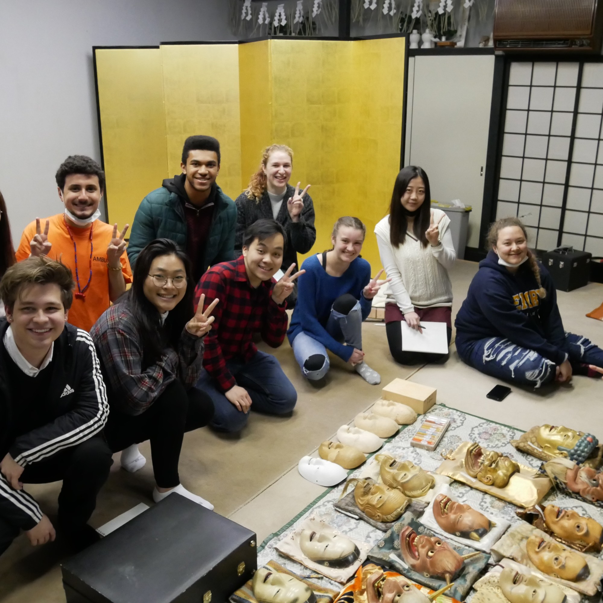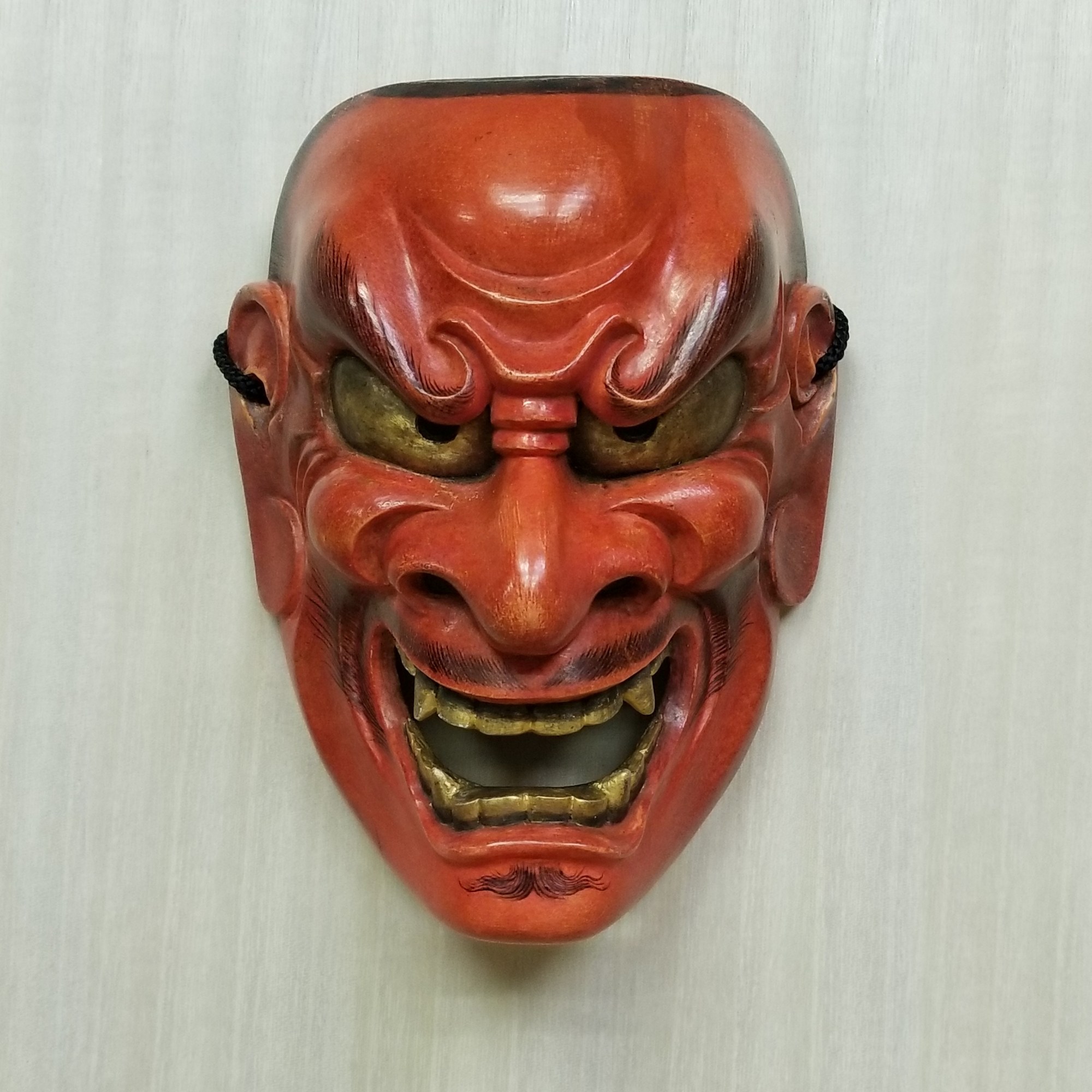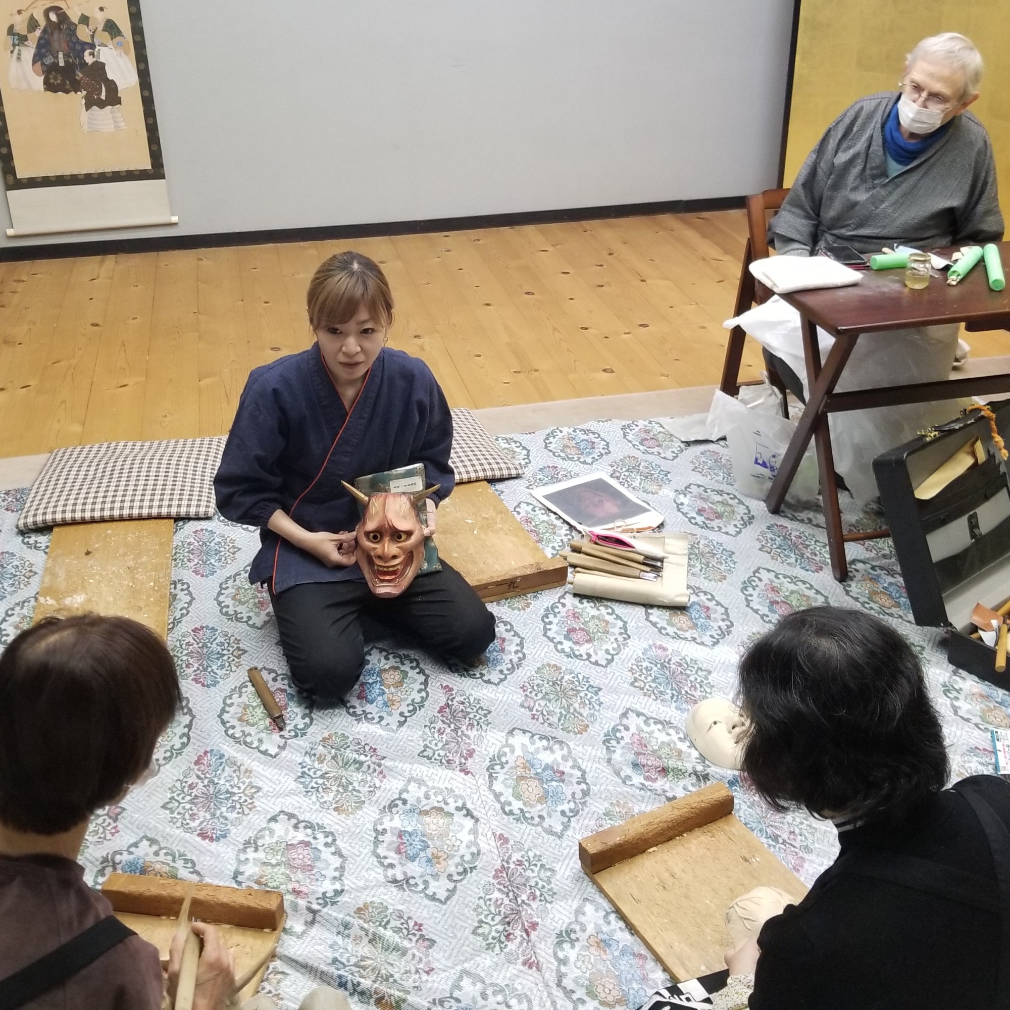 Students in Udaka Keiko‘s mask carving classes in Kyoto, and Tokyo learn to carve high quality masks that can be used in performance. Every two years a group mask exhibition is held in Kyoto to show the latest results of students efforts. These mask exhibitions include free-standing displays of some masks, performance pictures, costumes and lecture-demonstrations to promote a deeper understanding of the role of masks in noh.