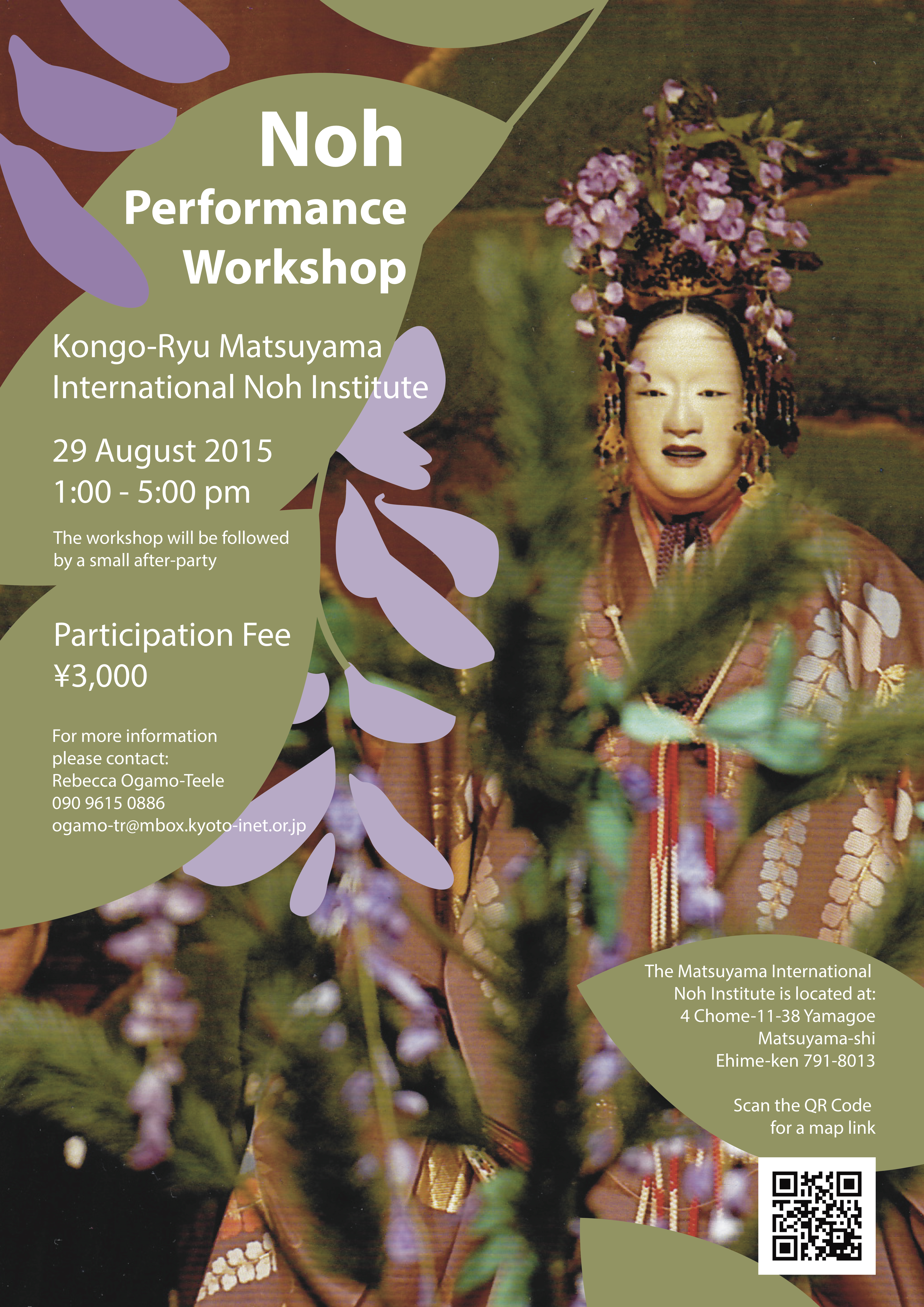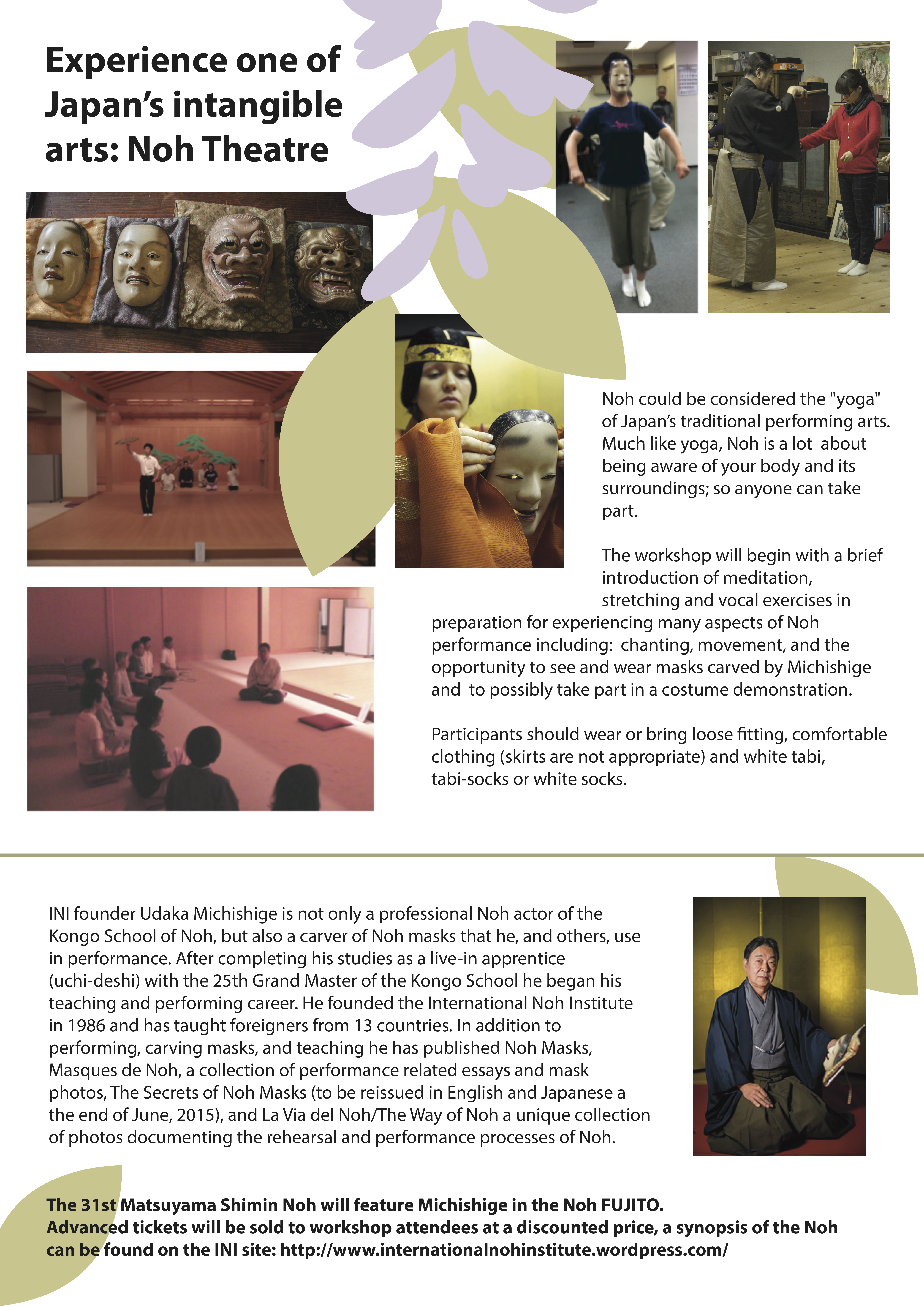 From 10:00 to 14:30 students of Udaka Michishige will perform dance and chant excerpts. INI members will also participate with the following shimai: Diego Pellecchia (高谷大悟): Kamo, Elaine Czech: Miwa. The performance of KIyotsune, Awaji, and Fujito will begin at 15:00.