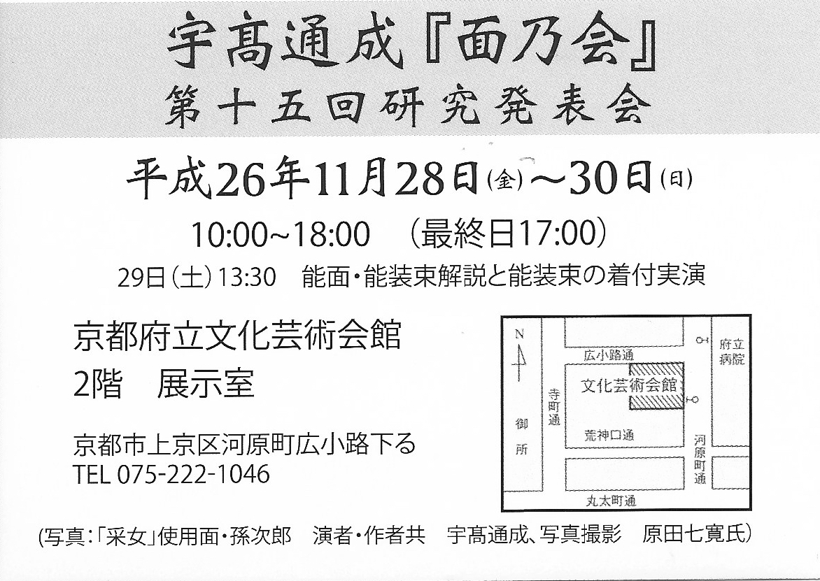 Udaka Michishige is unique in being both a shite actor of the Kongo School, and a Noh mask carver. This year’s Noh mask exhibition of the Men-no-kai, his group of students from Tokyo, Nagoya and Kyoto studying Noh mask carving will take place at the Kyoto Prefectural Center for Arts and Culture on Hirokoji-Kawaramachi dori, second floor, November 28th – 30th, from 10:00 to 18:00 (closes at 17:00 on the 30th). On November 29th (Sat.) from 13:30 there will be an explanation and a demonstration of the elaborate costuming of a Noh actor.