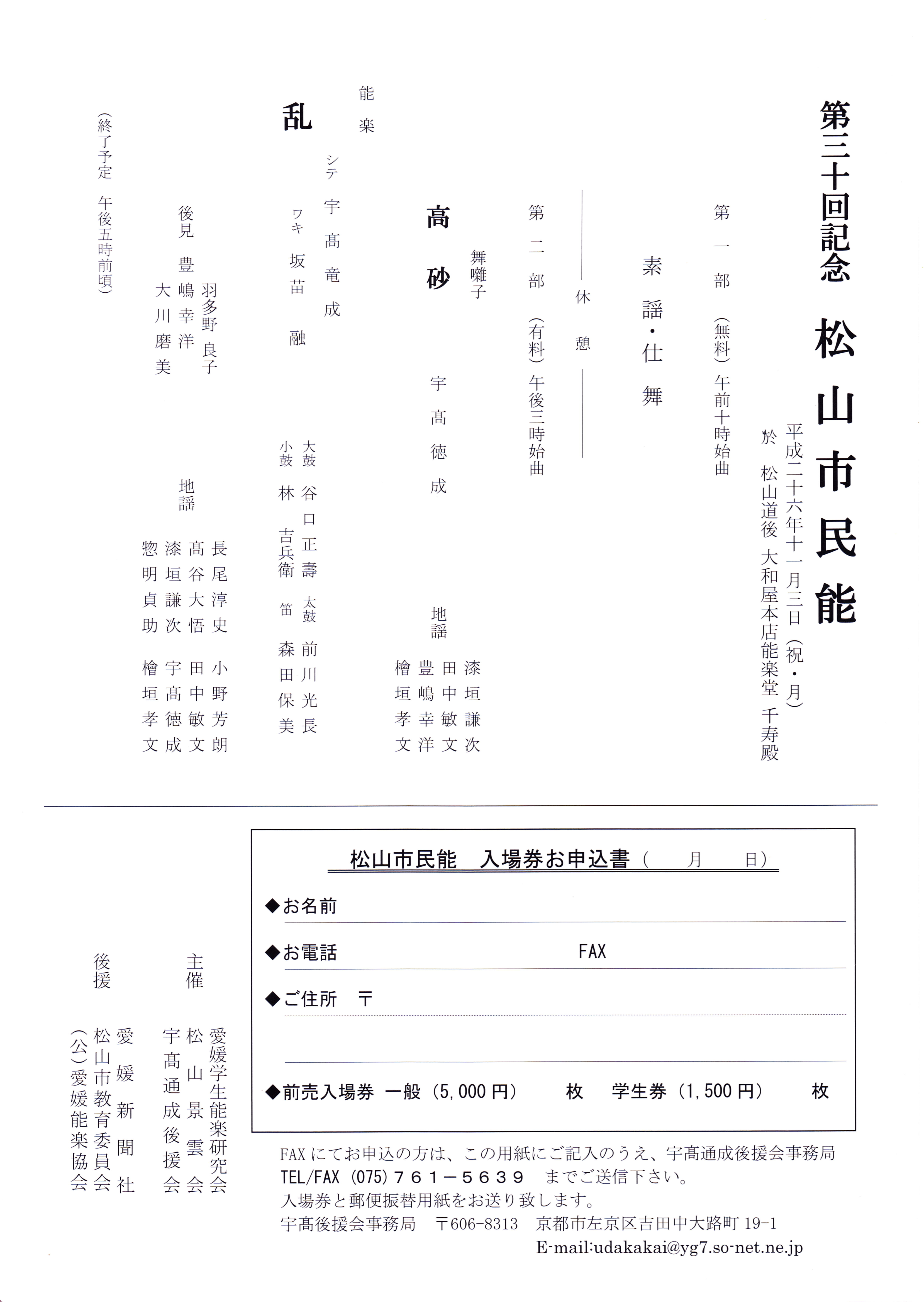 This year the Matsuyama Shimin Noh celebrates its 30th anniversary! On November 3rd 2014Udaka Tatsushige, Michishige’s elder son, will perform the Noh Midare, a special variation (kogaki) of the Noh Shōjō. Udaka Norishige, his younger brother, will perform the maibayashi (chant and dance excerpt with instrumental dance) from the Noh Takasago.